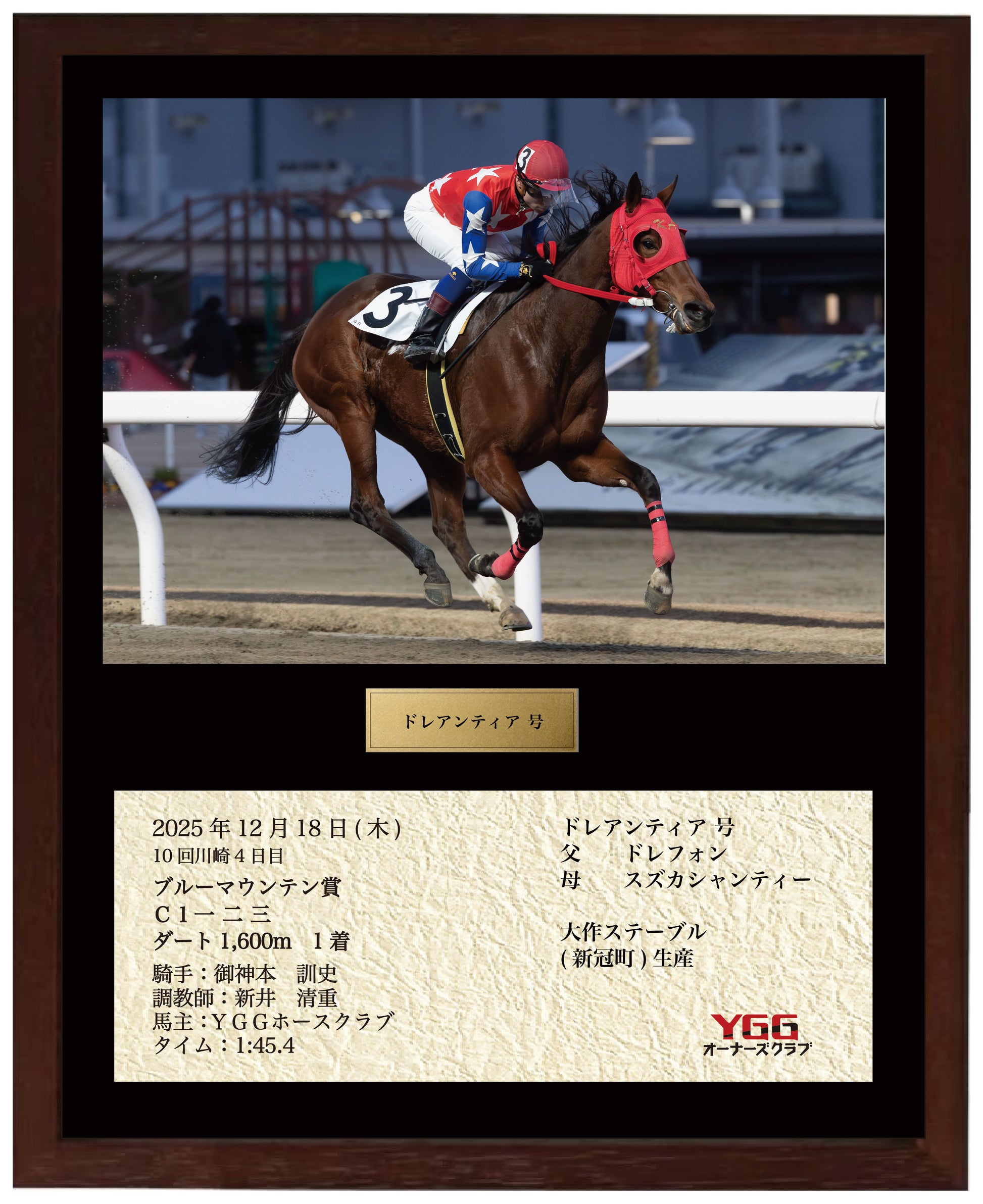 2025年12月18日川崎競馬4R「ブルーマウンテン賞 C1一 二 三」にて5馬身差の勝利を挙げたドレンティア号の額装を製作いたしました。