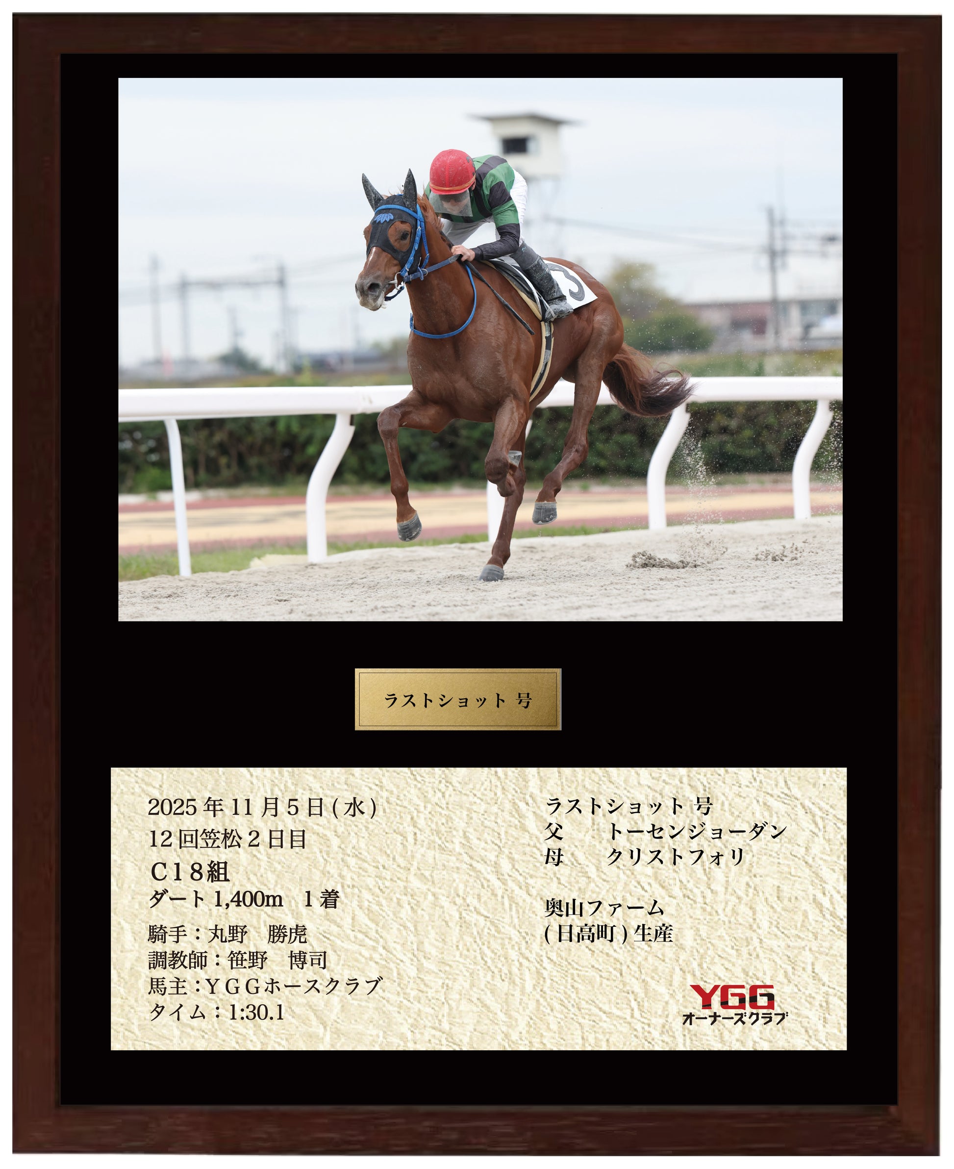 2025年11月5日笠松競馬5R「C18組」にて積極的な先行策で見事勝利を挙げたラストショット号の額装を製作いたしました。