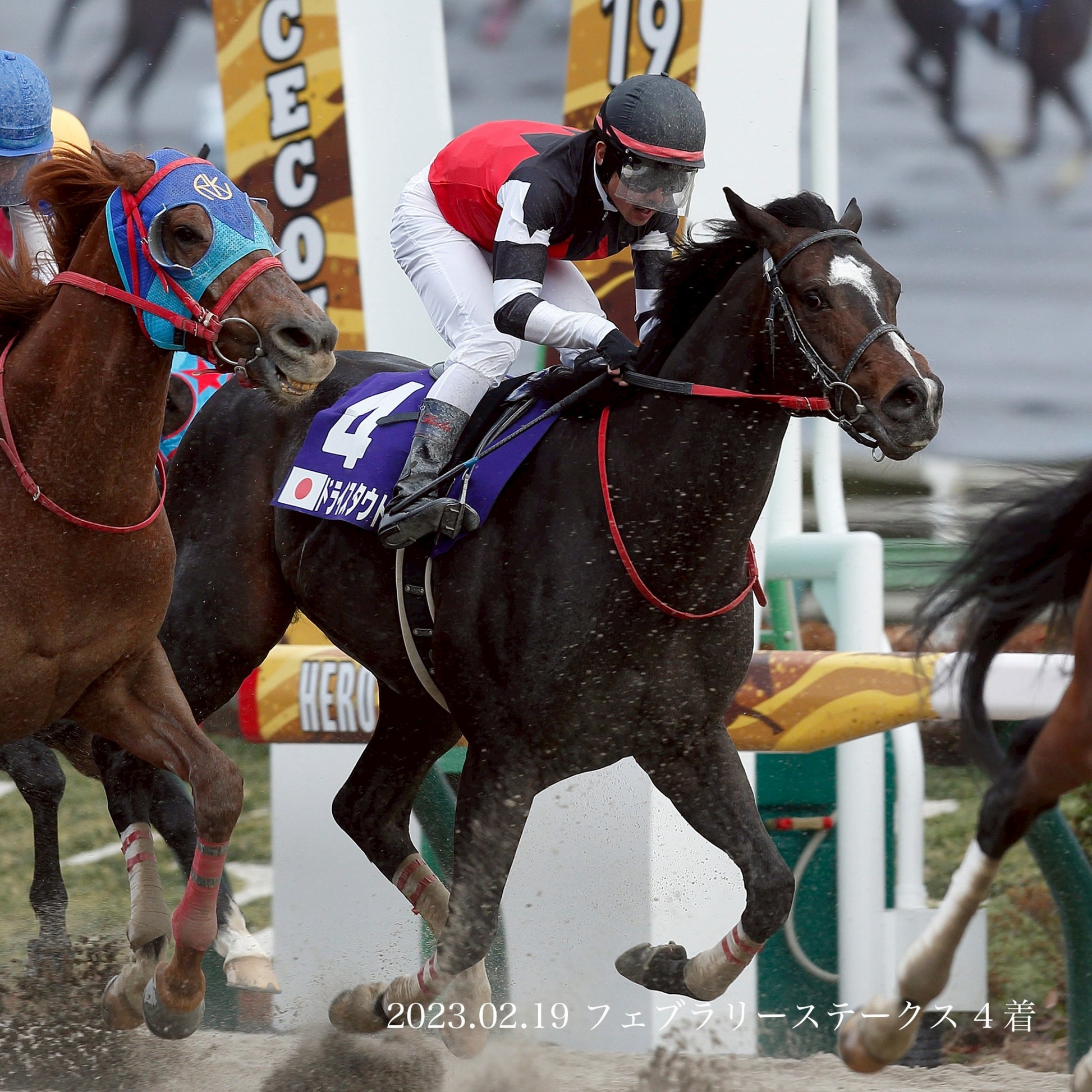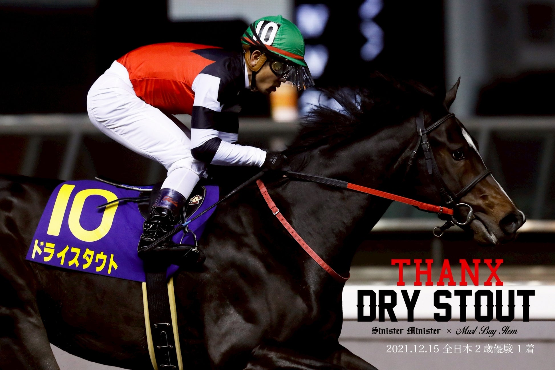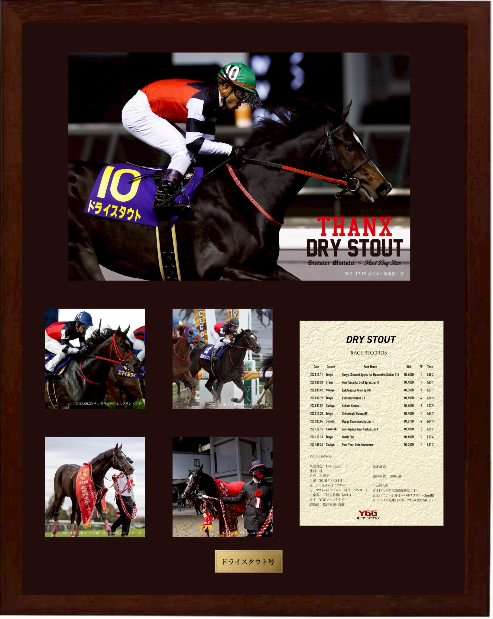 全日本2歳優駿(JpnⅠ)ゴールシーンを中心に、テレ玉杯オーバルスプリント・武蔵野ステークス・フェブラリーステークスの写真を収め、メタルアクリルプレートにドライスタウト号名を彫刻。